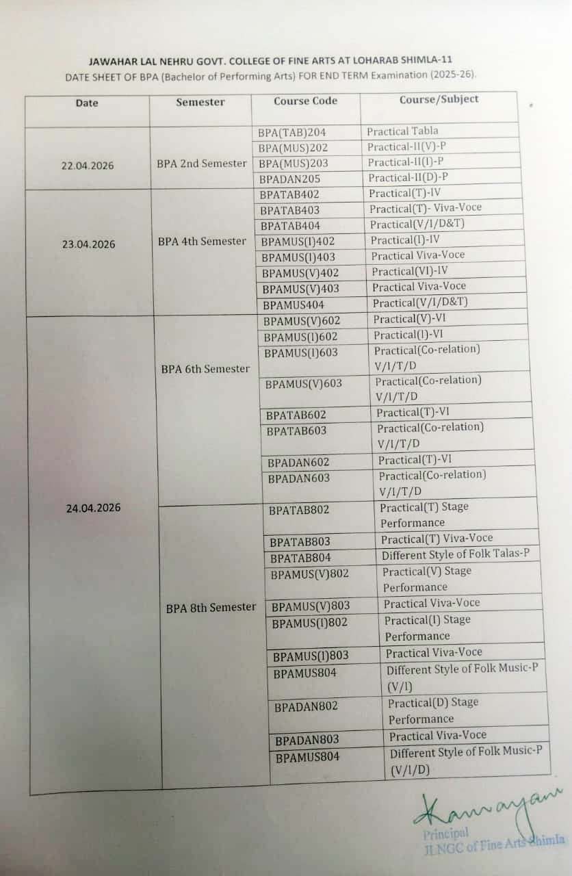 Datesheet of BFA even Semester examination to be held in April, 2026